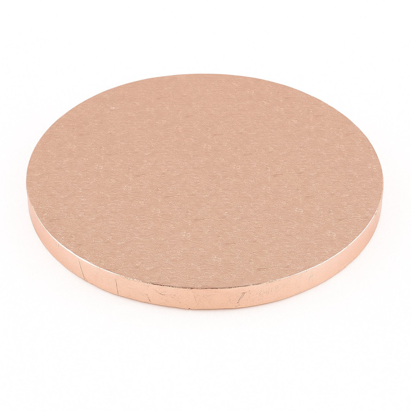 Semi-thick round cake board - 12 inch. Perfect base for large cakes and bottom tiers. Glamorous rose gold finish.